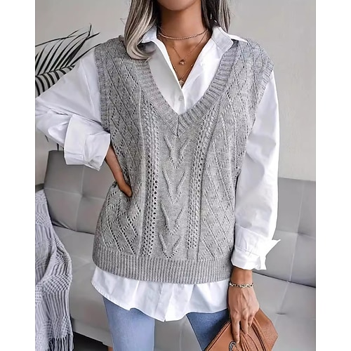 Per donna Gilet Casual Tinta unica Treccia Scollo a V Lavorato a maglia Senza Maniche Top Regolari Maglia All'aperto Ferie Uscire Grigio chiaro Autunno