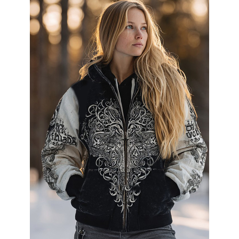Women's Zip Up Hoodies Viking Graphic Plaid Fashion Western Casual Long Sleeve Hooded Regular Tops Street Dailywear Casual Zipper Pocket Print Black Fall Winter