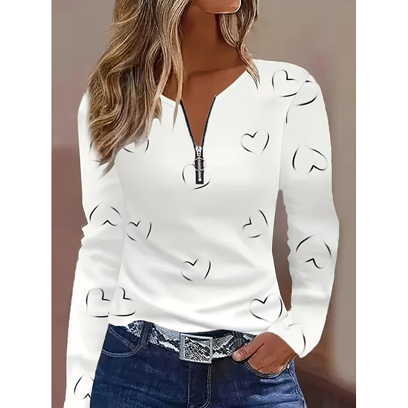 Valentine's Day Women's T Shirt Heart Graphic Vintage Fashion Stylish Long Sleeve Crew Neck Regular Tops Daily Zipper Print White Spring Fall
