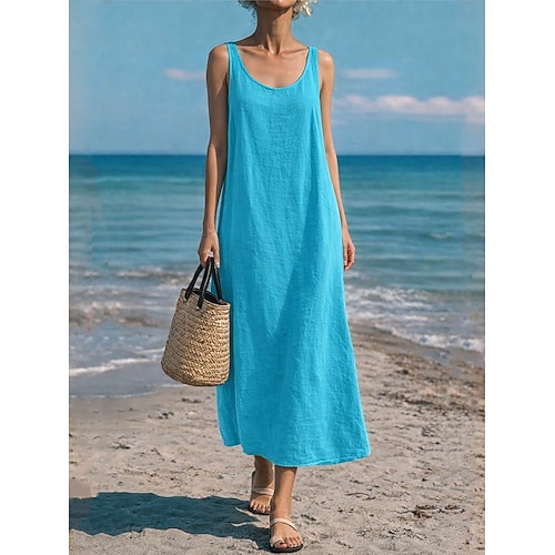 Per donna Abito maxi Finto cotone e lino Abito a Tubino Abito Estivo Abito Sottoveste Casual Spiaggia Quotidiano Vestibilità comoda Semplice Senza Maniche Collo a U Blu blu navy Giallo Rosso Estate