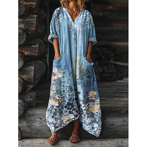 Per donna Abito maxi Abito Boho Vestito Casual Abito Stampato Vintage All'aperto Vacanza Weekend Vestibilità comoda Floreale Grafico Manica Lunga Scollo a V Blu Estate Primavera Autunno