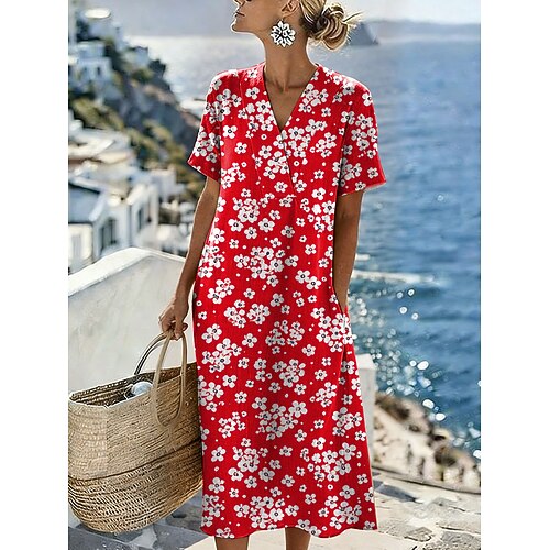 Per donna Abito Midi Abito a Tubino Vestito Estivo Vacanza Casual Spiaggia Vestibilità comoda Floreale Grafico Manica Corta Scollo a V Blu Rosa Rosso Viola Estate Primavera