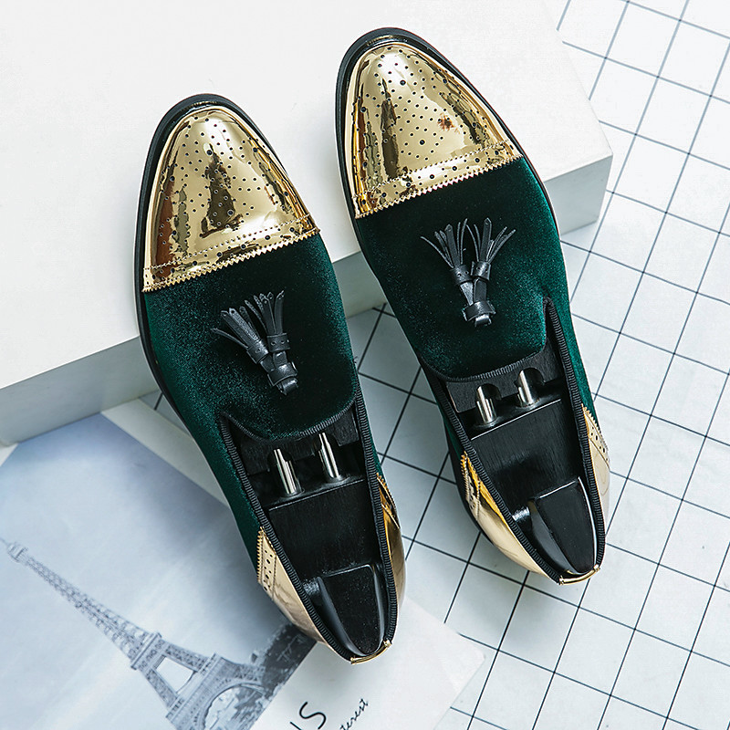 Men's Green Velvet Loafers with Gold Cap Toe and Tassel Detail - Elegant Formal Footwear for Parties, Weddings and Special Occasions