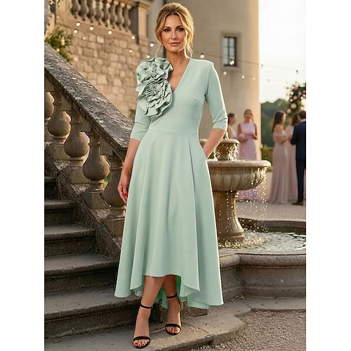 Linea ad A Lunghezza alla caviglia Abito Formale Abito da cerimonia per signora Manica 3/4 Scollo a V Elegante Vintage Formale Ospite di nozze Riunione di famiglia Crepe Elasticizzato con Fiori 3D