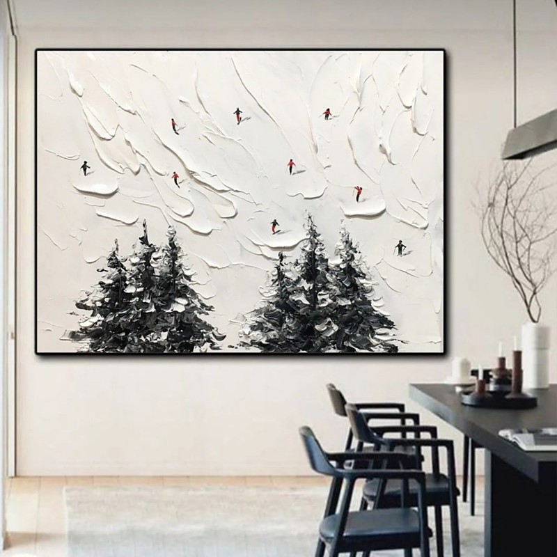 Handmade Oil Painting Canvas Wall Art Decoration Modern Abstract Thick Knife Winter Skiing Cedar Landscape for Home Living Room Decor Rolled Frameless Unstretched Painting