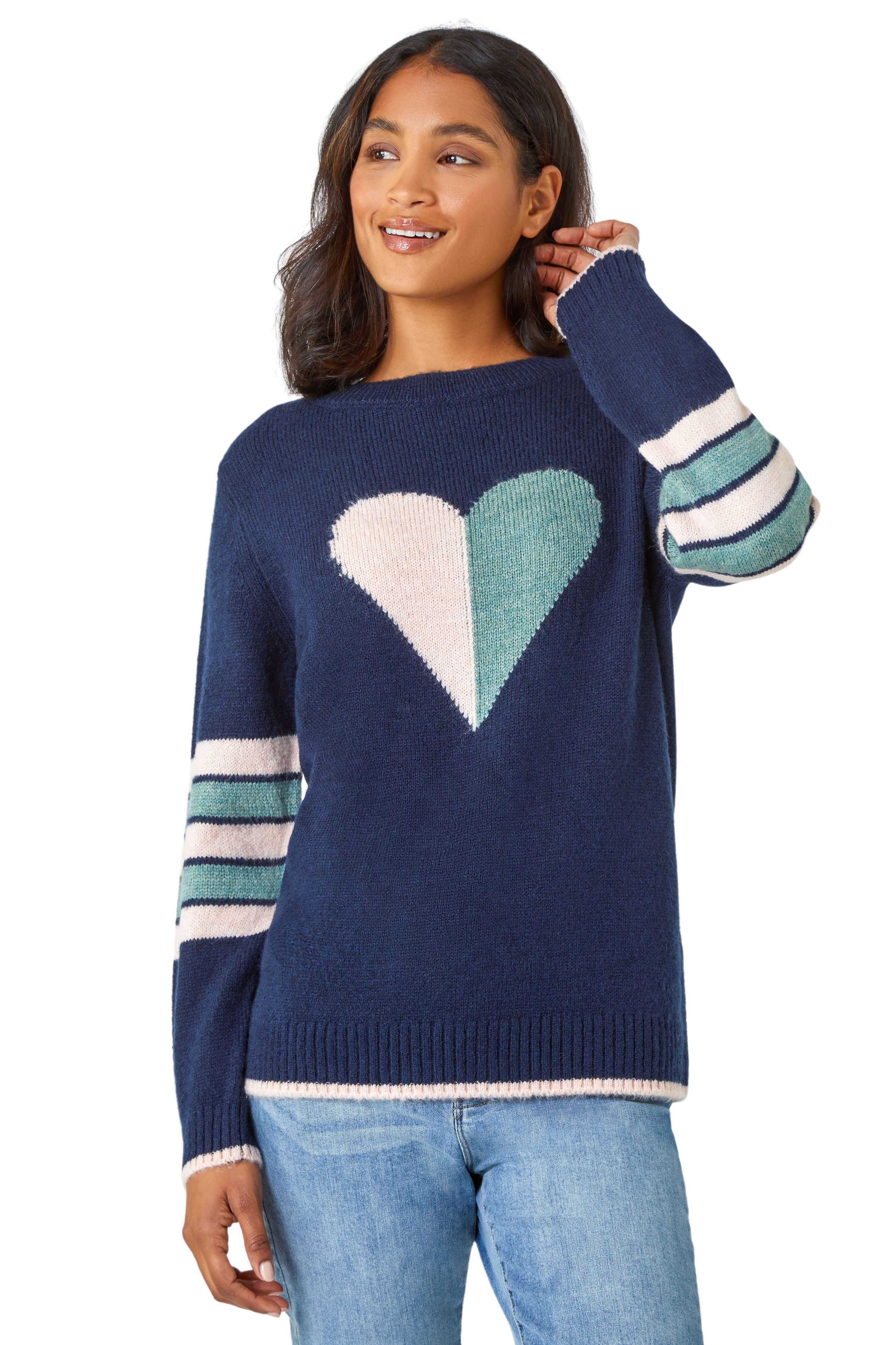 Roman Womens Heart Print Stripe Sleeve Jumper - Blue - Size 10 UK | Roman Sale | Discount Designer Brands
