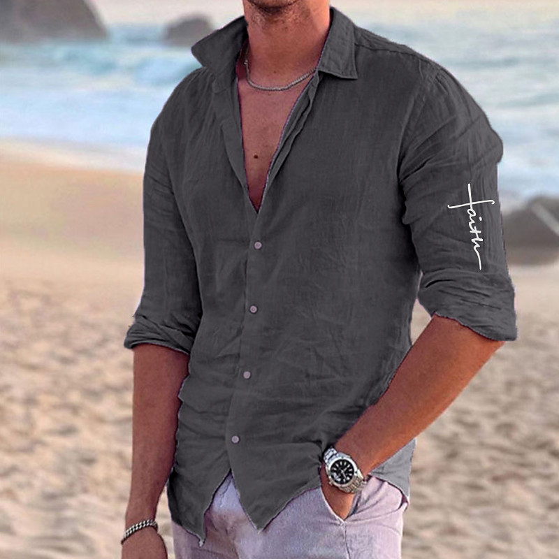 Men's Shirt Linen Shirt Beach Shirt Faith Outdoor Vacation Black White Pink Blue Long Sleeve Lapel Spring Fall Clothing Apparel Print