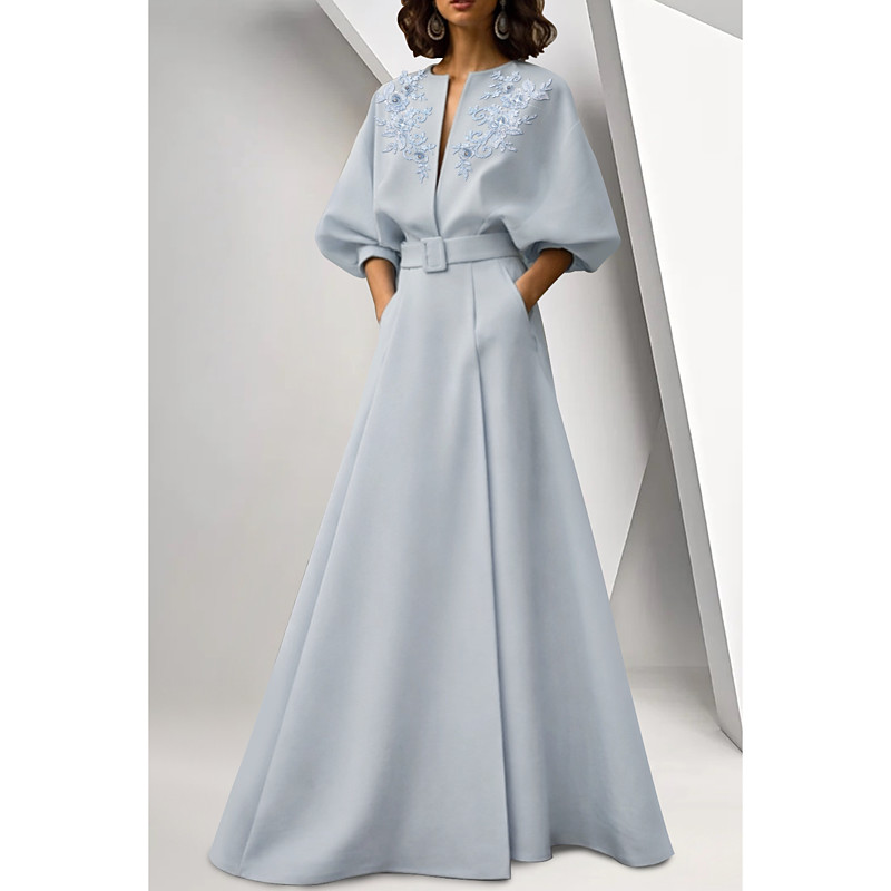 A-Line Floor Length Evening Gown Ball Gown Formal Dress Elegant Long Sleeve V Neck Wedding Formal Pocket Stretch Fabric with Embroidered Flower Embroidery Appliques