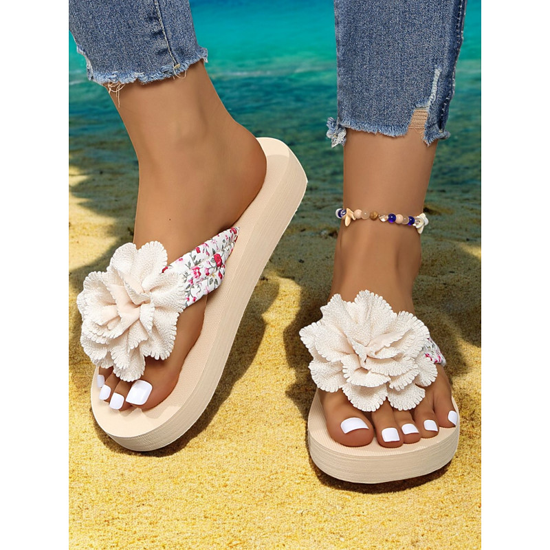 Beigefarbene Flip-Flops mit Blumenmuster für Damen mit gepolsterter Sohle, lässige Strandsandalen für den Sommerurlaub und zum Entspannen am Pool