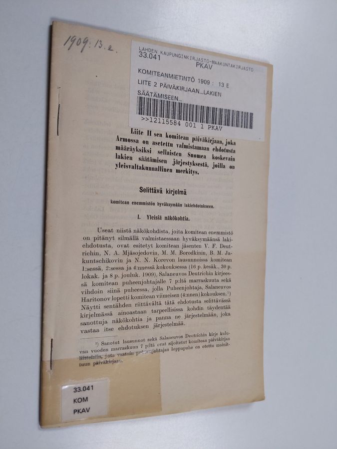 Liite II sen komitean päiväkirjaan, joka Armossa on asetettu valmistamaan ehdotusta määräyksiksi sellaisten Suomea koskevain lakien säätämisen ...