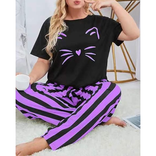 Per donna Attivo Blusa Set di Pantaloni Manica Corta Girocollo Gatto A righe Stampato Vacanza Casual Quotidiano Nero Giallo Rosa Autunno Vestibilità regolare