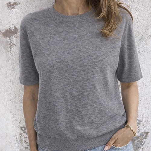 Per donna Maglietta a Maglia Elastico in vita A coste Tinta unica Vintage Elegante Casual Manica Corta Girocollo Top Regolari Quotidiano Uscire Nero Grigio Estate Primavera Autunno