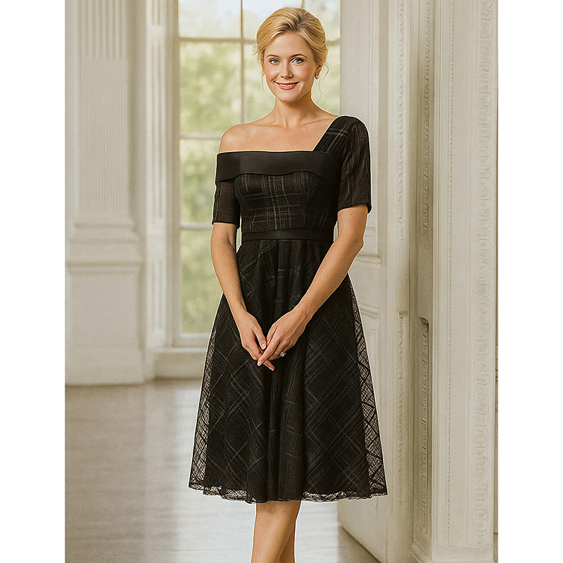 A-Line Tea Length Party Dress Cocktail Dress Wedding Guest Dress Mother of the Bride Dress Short Sleeve Off Shoulder Elegant Vintage Party with Pleats