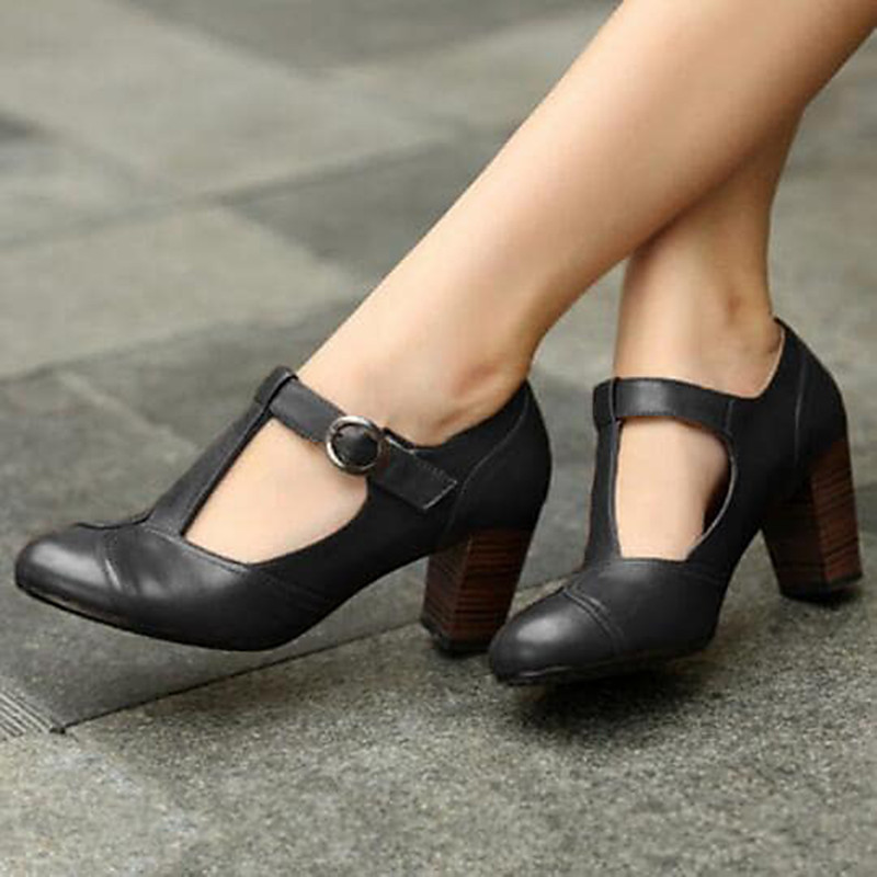 Women's Classic Brown Leather T-Strap Pumps with Chunky Heel, Vintage Office Shoes