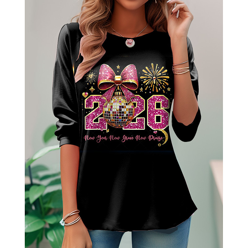New Year Women's T Shirt Graphic Letter Fashion Stylish Casual Long Sleeve Crew Neck Regular Tops Daily Weekend Print Black Pink Red Rose Pink Summer Spring Fall