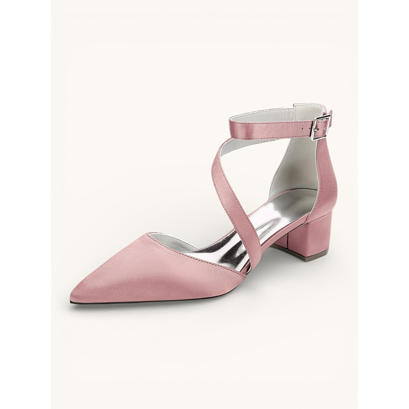 Women's Champagne Satin Block Heels - Pointed Toe Cross-Strap Dress Shoes with Ankle Buckle for Cocktail Parties and Semi-Formal Evenings