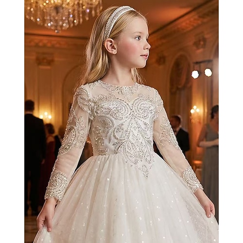 Abito da damigella d'onore bambina bambini Da ragazza Abito da principessa Prestazioni Matrimonio Feste Elegante Bellissimo Pizzo Retato Tinta unica Manica lunga Girocollo Bianco 4 anni