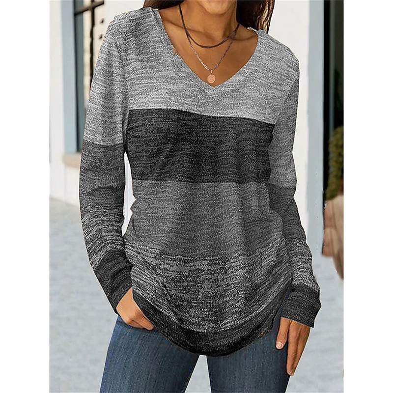 Women's T Shirt V Neck Long Sleeve Tunic Color Block Fashion Regular Tops Daily Weekend Print Blue Khaki Gray Spring Fall