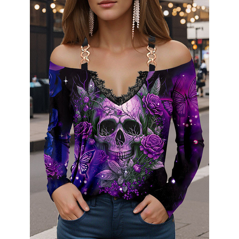 Women's Blouse Floral Skulls Print Graphic Skull Vintage Stylish Casual Long Sleeve V Neck Regular Tops Daily Going out Patchwork Print White Wine Red Purple Khaki Spring Fall