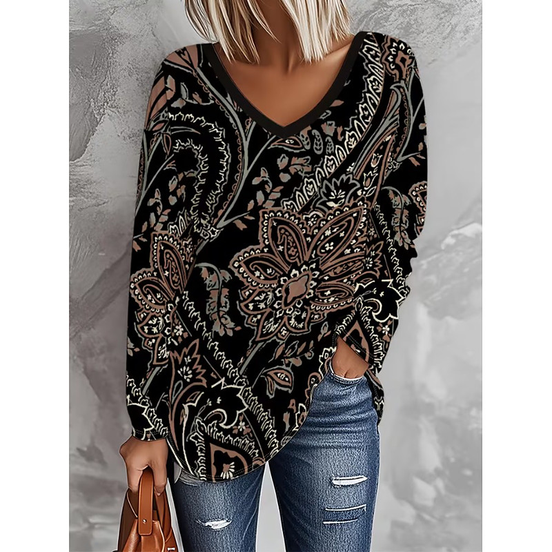 Women's T Shirt Graphic Plants Tribal Vintage Stylish Classic Long Sleeve V Neck Regular Tops Daily Print Black Spring Fall Winter