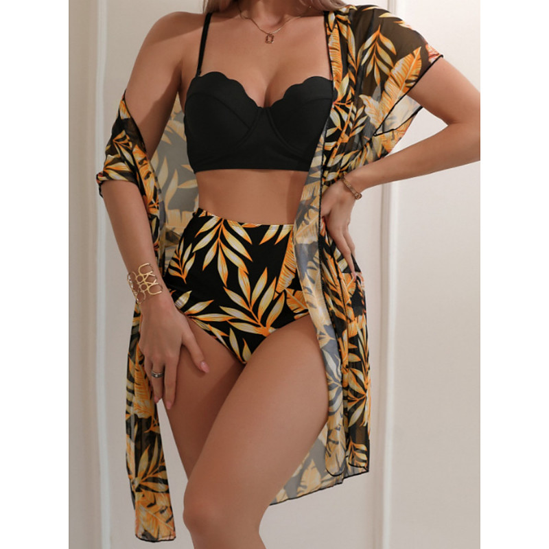 Women's Bikini 3 Piece Swimsuit Palm Briefs Slim Backless Vacation Beach Wear Leaves V Neck Sleeveless Bathing Suits