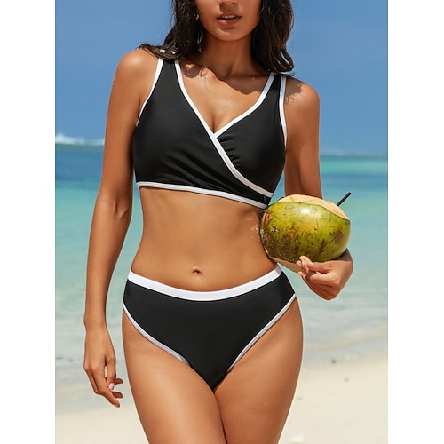 Damen Bikini 2-teiliges Badeanzug Colorblock Cheeky Slim Rückenfrei Urlaub Strandbekleidung Farbblock V-Ausschnitt Ärmellos Badeanzüge