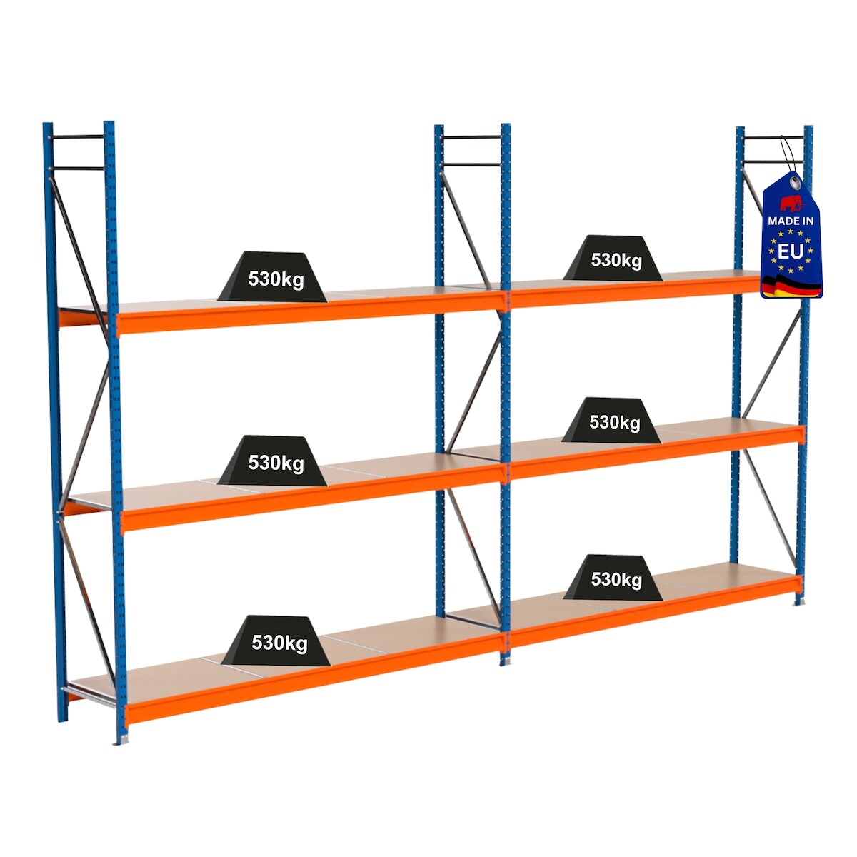 PROREGAL Industrie Schwerlastregal MAXIMUS PRO, Komplettregal, HxBxT 300x500x60cm, 3 Ebenen, Spanplatten-Fachboden, Fachlast 530 kg, Blau/Orange