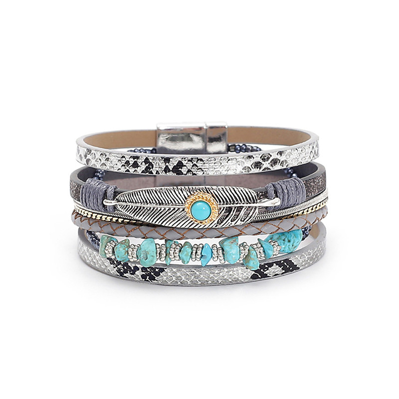 Boho Leather and Turquoise Magnetic Bracelet Wristband - Adjustable multi-layered design with feathers and gemstones, perfect for casual, summer and festival styles