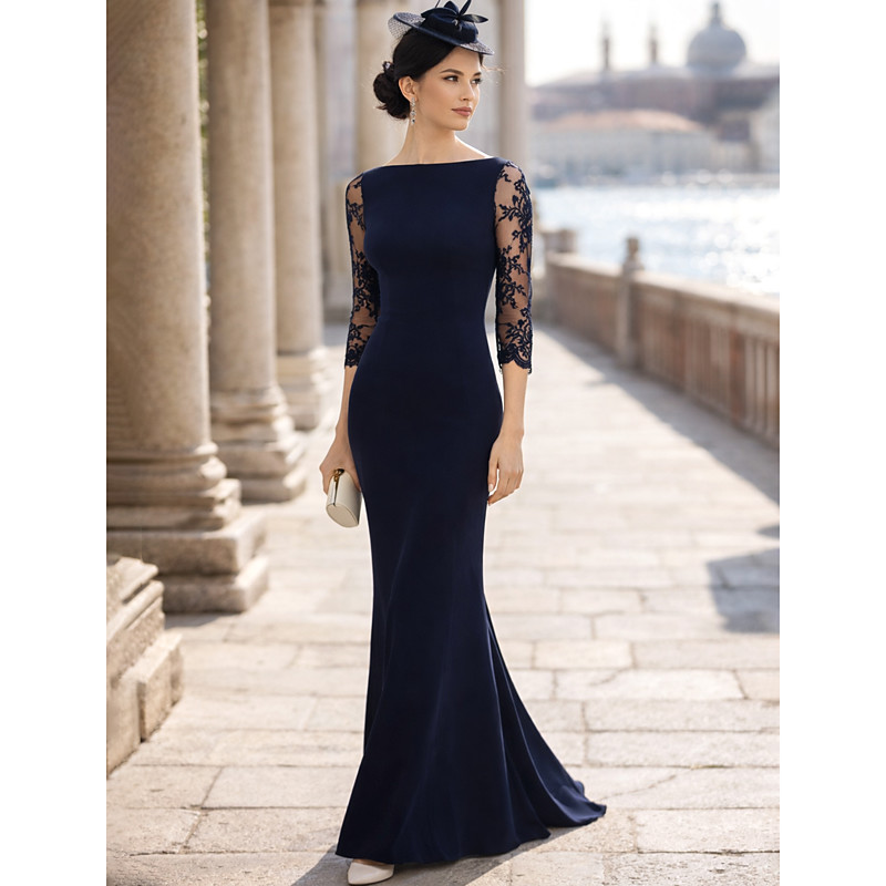 Sheath Column Floor Length Wedding Guest Dress Formal Dresses Evening Gown Mother of the Bride Dress 3/4 Length Sleeve Scoop Neck Vintage Party Wedding Guest Formal Evening Lace Stretch Fabric with