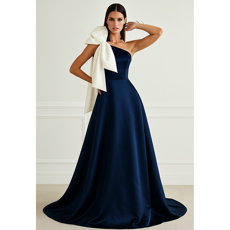 A-Line Floor Length Evening Gown Ball Gown Formal Dress Elegant Silky Sleeveless One Shoulder Wedding Formal Pocket Satin with Glitter Bow(s)