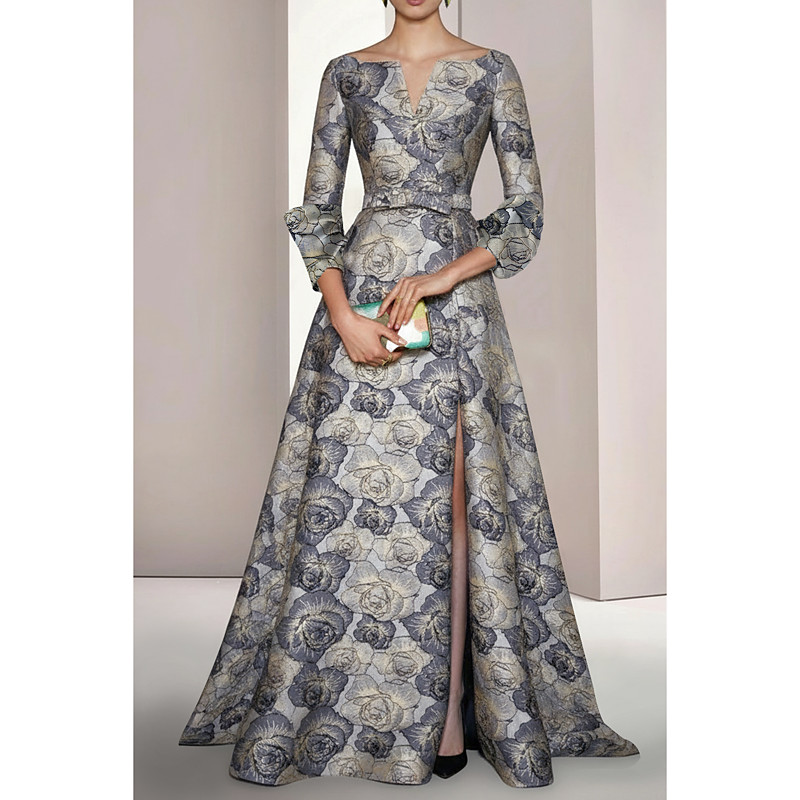 A-Line Floor Length Evening Gown Ball Gown Formal Dress Elegant Vintage Floral Long Sleeve V Neck Wedding Formal Pocket Jacquard with Embroidery