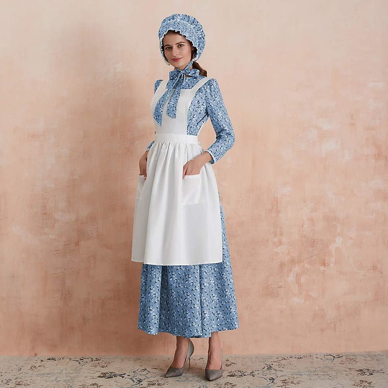 Book Week 2026 19th Century 1800s Prairie Dress Bonnet and Apron Set Long Sleeves Pioneer Floral A-Line Fancy Dress Women's Halloween Carnival School Event Dress Up Historical reenactment Adults'