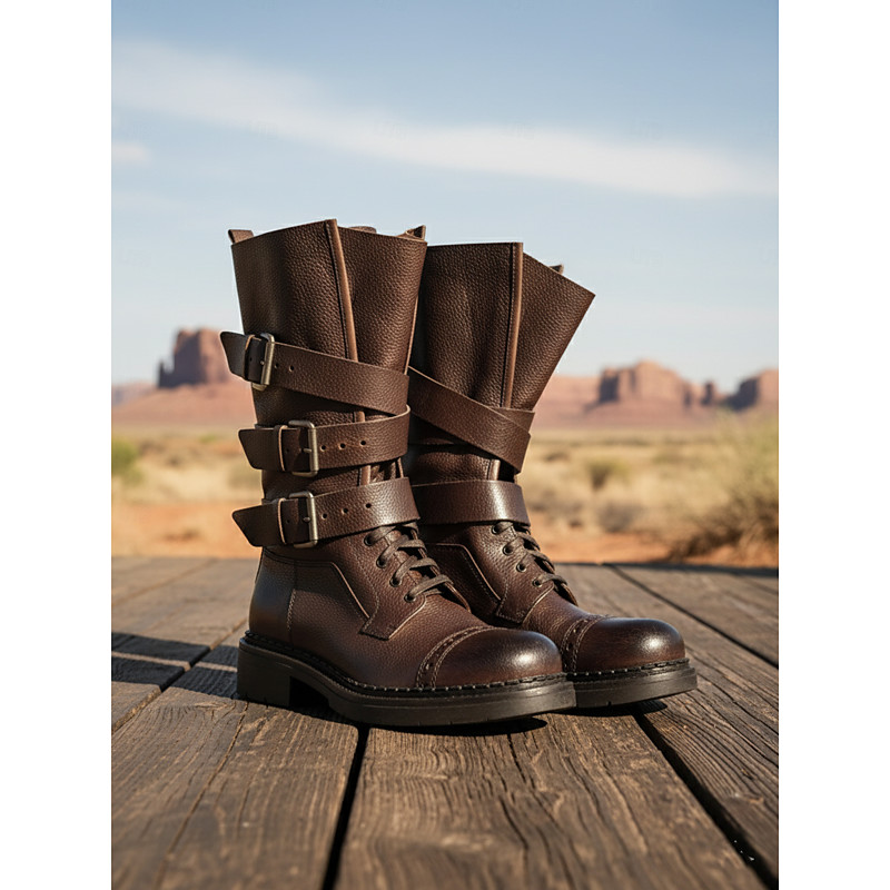 Men's Brown Genuine Leather Ankle Motorcycle Boots with Buckle Straps and Retro Design, Durable Biker Boots for Riding, Outdoor Adventures and Casual Wear