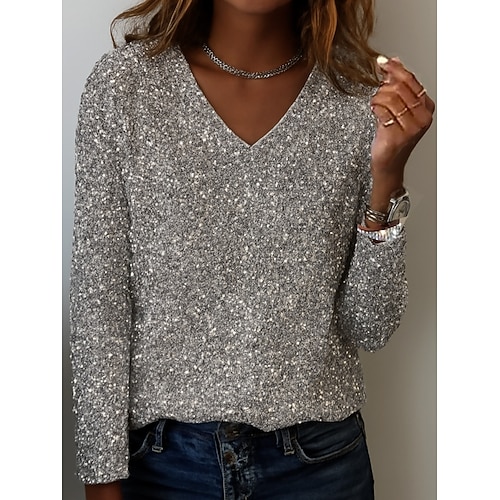 Natale Per donna Blusa Tinta unica Elegante Essenziale Casual Manica Lunga Scollo a V Top Regolari Quotidiano Paillettes Argento Nero Rosso Verde Primavera Autunno Inverno