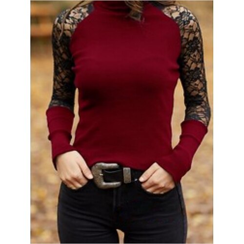 Per donna Blusa Tinta unica Elegante Casual Manica Lunga Collo Alto Top Regolari Quotidiano Pizzo Patchwork Blu Nero Vino Blu Reale Viola Primavera Autunno Inverno