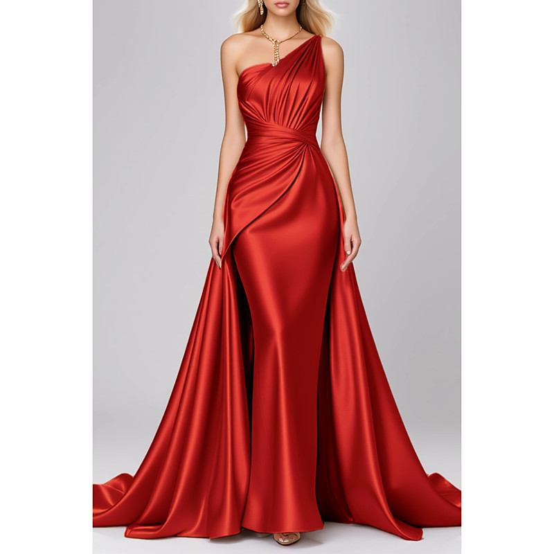 Mermaid Trumpet Floor Length Evening Gown Ball Gown with Overskirt Formal Dress Elegant Black Dress Sleeveless One Shoulder Wedding Formal Pink Dress Stretch Satin with Pleats