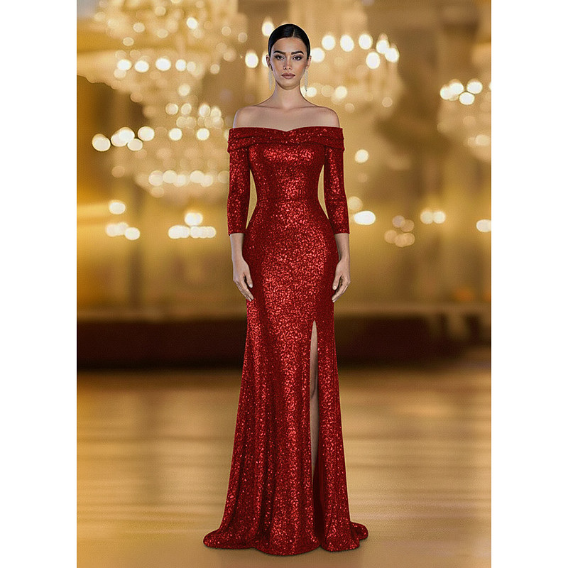 Mermaid Trumpet Floor Length Prom Dresses Evening Gown Ball Gown Formal Dress Elegant Vintage 3/4 Length Sleeve Off Shoulder Wedding Formal Sequined with Ruched Sequin Slit