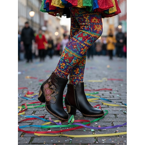 Damen Mardi Gras Karneval Blaue Blockabsatz-Ankle Boots – Premium Rindsleder bestickter Vintage Volksstil unterstützende Absätze für Paraden Kostüme den täglichen Gebrauch und festliche Anlässe