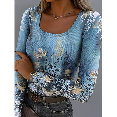 Damen T-Shirt Langarm Rippstruktur Grafisch Quadrat Ausschnitt Langarm Lässig Floral Pflanzen Klassisch Normal Tops Täglicher Druck Schwarz Weiß Pink Rot Marineblau Frühling Herbst Vorsaison