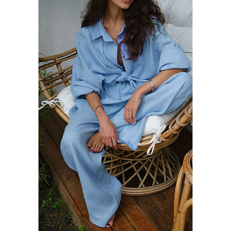 Women's Fashion Basic Shirt Linen-Inspired Sets Two Piece Sets Long Sleeve Shirt Collar Solid Color Dubbele Rij Knopen Vacation Casual Daily White Red Dark Navy Summer Regular Fit