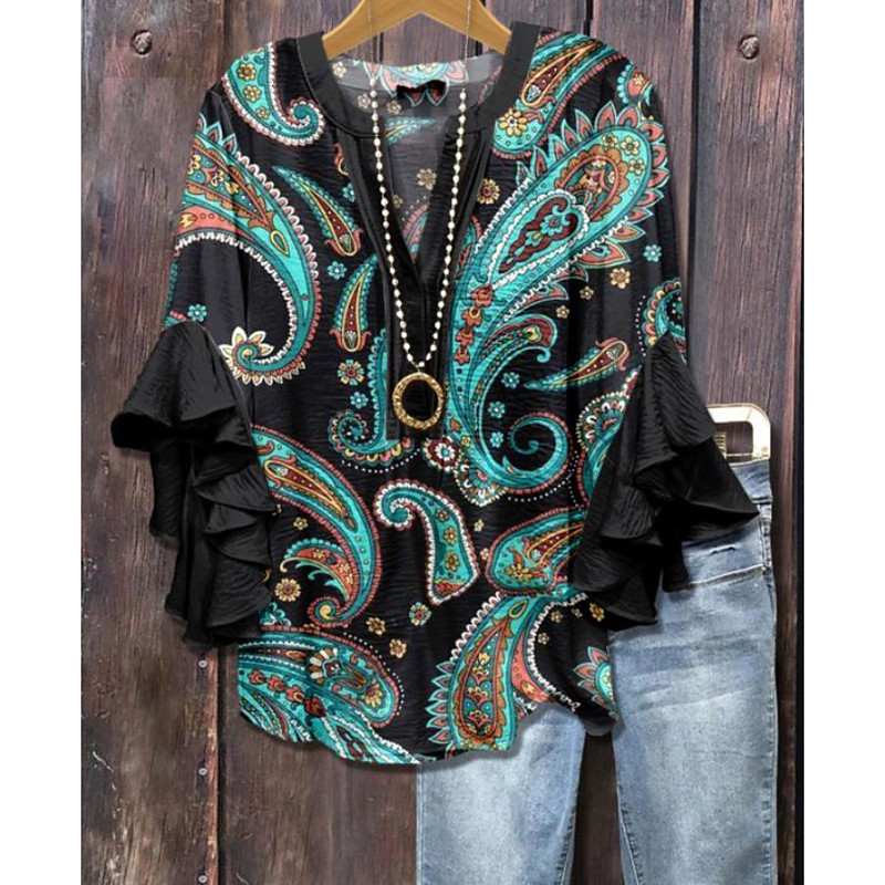 Women's Blouse Tunic V Neck Long Sleeve Boho Casual Tops Floral Graphic Vintage Tropical Regular Tops Daily Wear Print White Pink Blue Green Gray