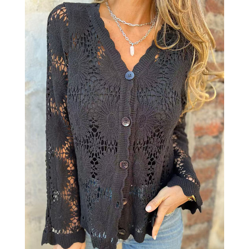 Women's Elegant Lace Tops Eyelet Sexy Blouse Casual Solid Color Regular Tops Long Sleeve V Neck Lace Patchwork Regular Fit Daily Black Romantic Petite Tops Summer Holiday Wear Evening Tops