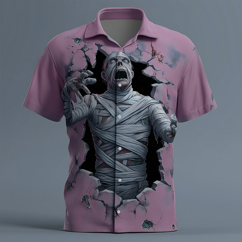 Men's Zombies Mummy Cracked Wall Shirt Button Up Shirt Short Sleeve Dark Gothic Style Holiday Streetwear Summer Spring Turndown 3D Print Collared Shirts Light Green Pink Purple Green Khaki