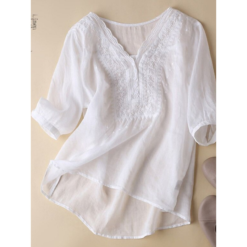 Women's Cotton Linen Shirts Solid Color Basic Casual 3/4 Length Sleeve V Neck Regular Tops Daily Lace Patchwork White Pink Sky Blue Summer