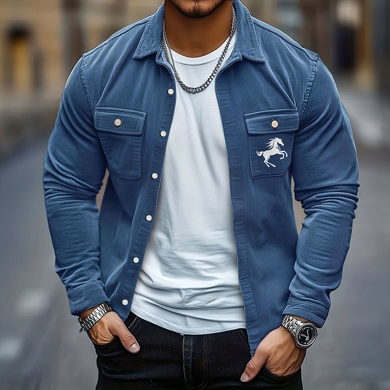 Men's Animal Horse Corduroy Shirt Shirt Jacket Overshirt Long Sleeve Casual Outdoor Dailywear Fall Winter Turndown Button-Down Warm Jacket with Flap Pockets Black Blue Green Khaki Gray