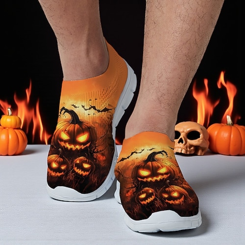 scarpe da ginnastica slip-on arancioni da uomo in Flyknit con stampa di zucche di case infestate – scarpe casual per festival di Halloween, feste notturne, cosplay ed eventi all'aperto