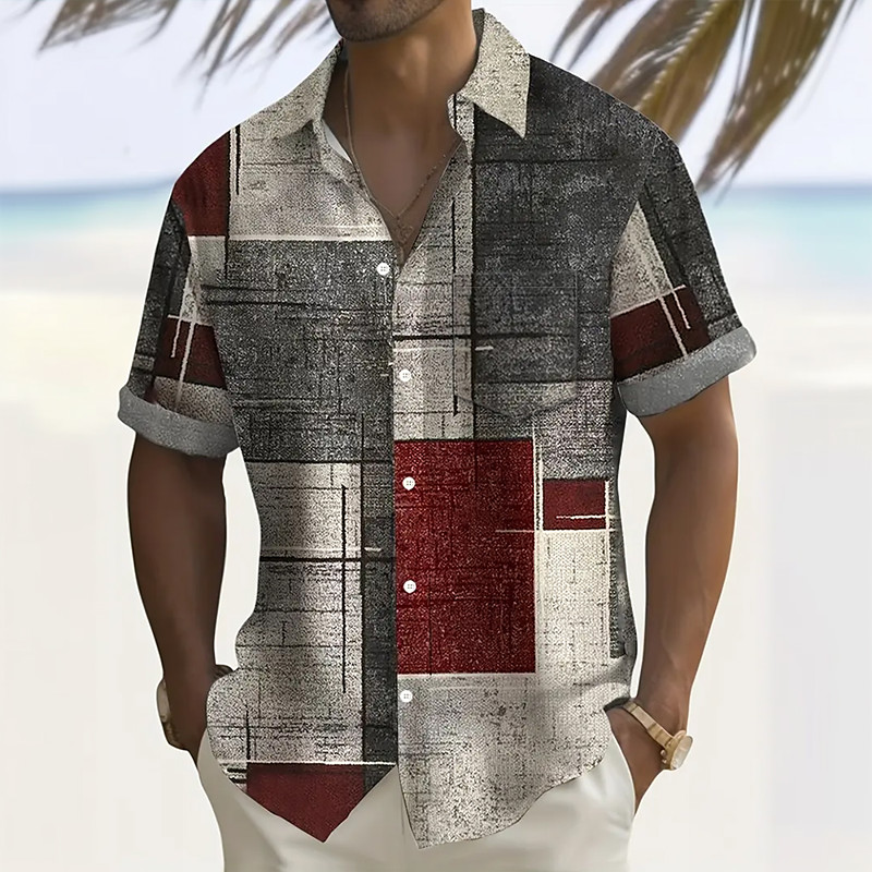 Men's Geometric Color Block Patchwork Shirt Button Up Shirt Short Sleeve Fashion Casual Vacation Holiday Streetwear Summer Turndown 3D Print Collared Shirts Front One Pocket Gray