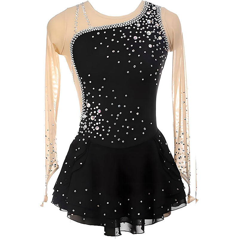 Figure Skating Dress Women's Girls' Ice Skating Dress Black Patchwork Asymmetric Hem High Elasticity Training Competition Skating Wear Classic Crystal / Rhinestone Long SleeveIce Skating Figure