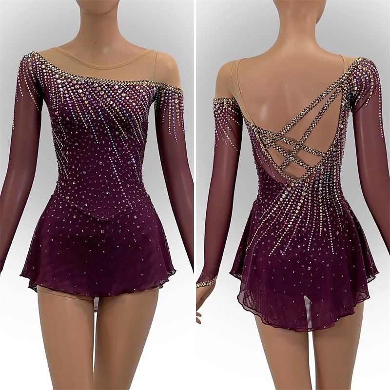 Figure Skating Dress Women's Girls' Ice Skating Dress Dark-Gray Violet Purple Mesh Spandex High Elasticity Training Practice Competition Skating Wear Handmade Classic Crystal / Rhinestone Long Sleeve