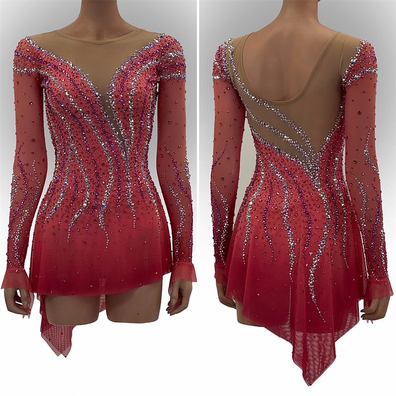 Figure Skating Dress Women's Girls' Ice Skating Dress Red Patchwork Asymmetric Hem Spandex Mesh High Elasticity Training Professional Competition Skating Wear Classic Crystal / Rhinestone Long Sleeve